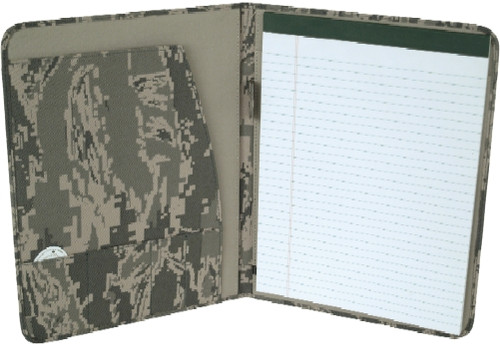 USAF ABU camouflage padfolio. 600D polyester. Interior slash pocket for legal size papers. Four small slash pockets for accessories. ABU Pen holder. Pen not included. Product size 12 1/4" h x 19 1/4" when opened.