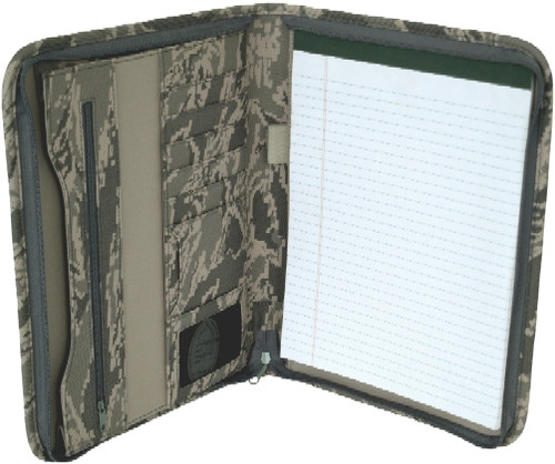 ABU camouflage zippered padfolio. Constructed of 600D polyester. Outside slash pocket. 5 credit card slots. Mesh ID window. Two inner slash pockets. Zippered storage pocket. Large gusseted storage pocket. Includes 8 1/2" x 11" writing pad and elastic pen loop. Product size 13 1/4" h x 20" w opened. Pen not included.