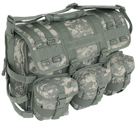 ACU digital camouflage laptop messenger bag. Removable heavy duty padded laptop computer case. 600D polyester. Heavy duty double-coated PVC back lining for extra strength & durability. Nylon-lined padded large main compartment. Expansion feature with dual zippers. Multiple gear pockets. MOLLE loops with multiple attachment points. Interior ID pocket. 3 detachable MOLLE pockets on the front of bag. Velcro closure. Top grab handle. Back zippered document pocket with MOLLE loops. Adjustable & removable padded shoulder strap. Maximum volume capacity 1286 cubic inches.