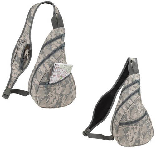 ACU DIGITAL CAMO SLING BACKPACK. ZIPPERED MAIN COMPARTMENT. ZIPPERED SIDE POCKET. FRONT POCKET. PEN HOLDER ON STRAP. PEN NOT INCLUDED. WOVEN POLY WEB DURABLE CARRY HANDLE. PADDED SHOULDER STRAP WITH ADJUSTABLE BUCKLE. PRODUCT SIZE 9" W X 15 3/4" H X 4 1/2" DEEP. IMPRINT AREA 6" W X 3" H.