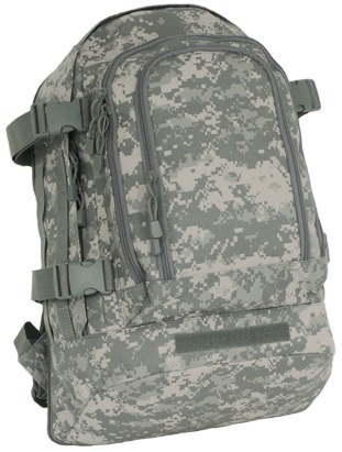 ACU stretch backpack. 600D poly. Double-coated PVC lining for strength & durability. Large main compartment with expansion feature. Multiple gear pockets and MOLLE loops. Mesh ID pocket. Maximum volume capacity 3920 cubic inches. Weight 5 lbs. Product size 20.5" x 15" x 7.75" to 12.75".