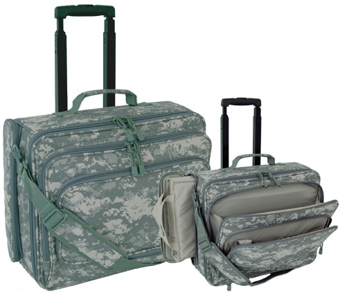 ACU laptop flight bag. Quiet inline precision skate wheels. Telescopic handle. Constructed of durable 600D polyester with heavy duty PVC backing. Front organizer with zipper pockets. Zippered file gusset and mesh pockets. Zippered easy access side loading padded laptop case enclosure. Detachable and adjustable shoulder strap with luggage tag. Back zippered pocket. Product size 16" x 13 1/4" x 6"