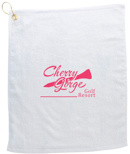Loading... Please wait...Simple white golf towel. 100% cotton. Hemmed edges. Metal grommet and clasp for attachment to golf bag. Product size 14 3/8" w x 17 7/8" h. Imprint area 7" w x 5" h. Towel available solid blue & solid black. (Add .20 each)